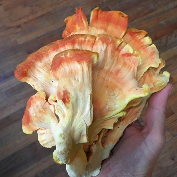 Most of our Chicken of the Woods strains are isolated from native stock on the East Coast of the U.S., meaning they prefer hardwoods, specifically varieties of oak. This species is a polypore, with no gills, and is best harvested young by slicing the outermost tender, silky tissue on the tips, which can regenerate more tips if you go back and harvest a week or so later! Fruiting bodies range from light salmon to bright orange in color and wither white or yellow tube color depending on the species. This mushroom must be chopped and boiled in water, then tossing the water, and cooked like you normally would chicken. My favorite way is to turn it into chicken of the woods parmesan. It is so tasty this way.