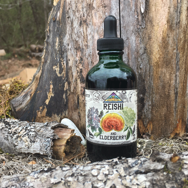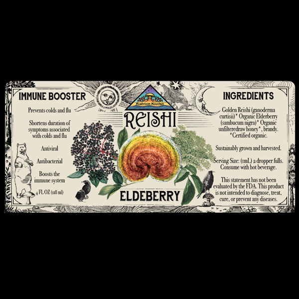 Ingredients: Organic Golden Reishi (Ganoderma curtisii), Organic elderberry (Sambucum nigra), organic raw unfiltered honey, brandy.